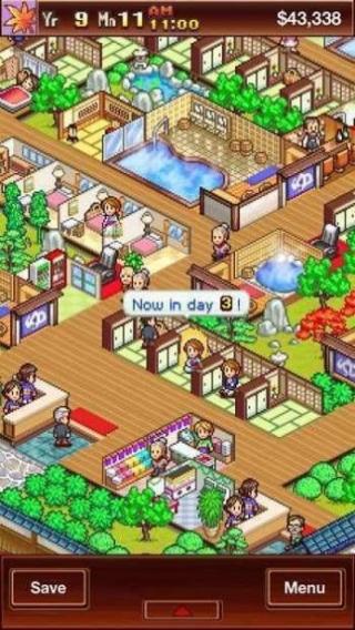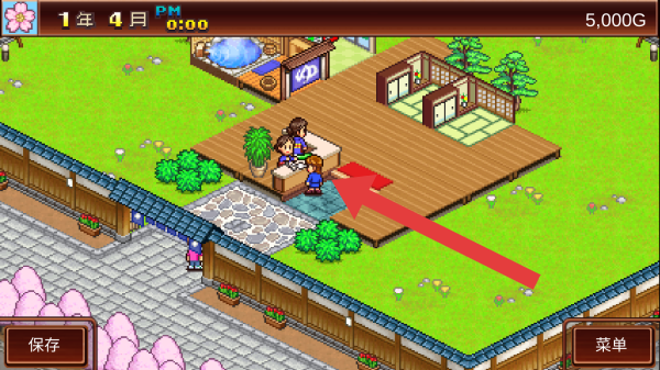 2、呈现的是温泉旅馆经营场景,实体信息有时间、金币,还有“保存”“菜单”功能按钮,画面中是旅馆庭院、建筑及人物互动场景,属于该模拟经营常规经营界面。
