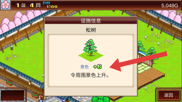 3、时间“1年4月PM1:00”、金币“5,048G”,设施“松树”,其属性为“景色+6,令周围景色上升”,还有“返回”按钮,属于设施信息查看界面。