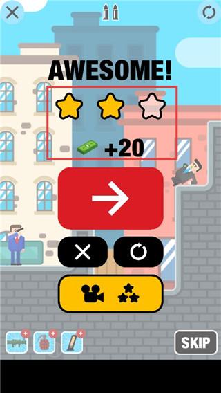 1、射击操控玩法:玩家点击屏幕调整射击角度与力度,释放手指发射子弹,利用物理反弹原理绕过掩体攻击敌人,完成闯关。