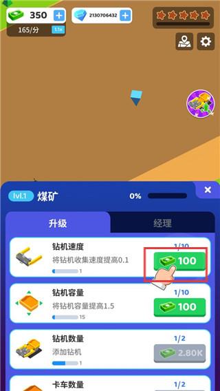 1、采矿操作流程:玩家操控矿工在矿区开采原煤与稀有矿产,点击屏幕可加速开采,通过升级钻头等设备提升采矿效率。