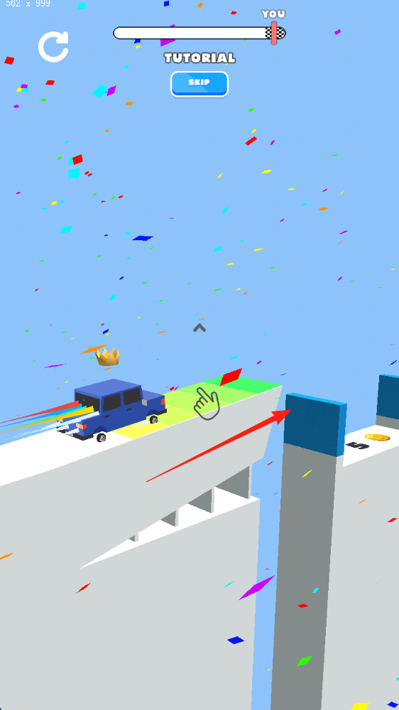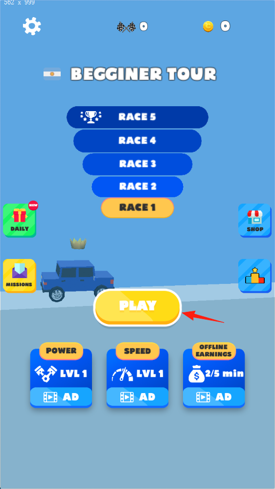 1、点击【PLAY】(红箭头),进入RACE1,操控蓝色汽车,在彩色赛道跳跃,收集皇冠,熟悉操作。