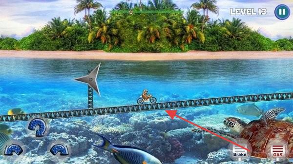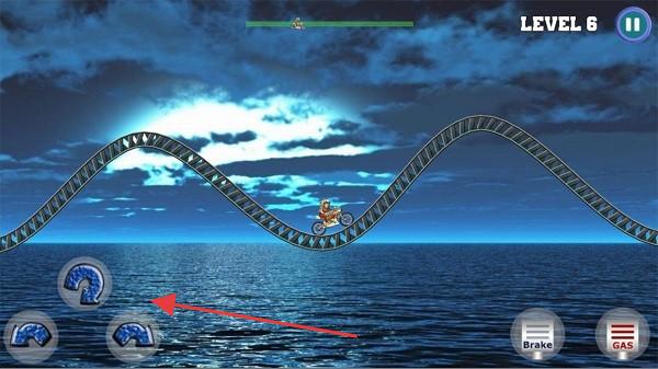 2、在海洋/海岛赛道,用“Gas”加速、“Brake”减速,控摩托平衡,过环形、波浪轨道。