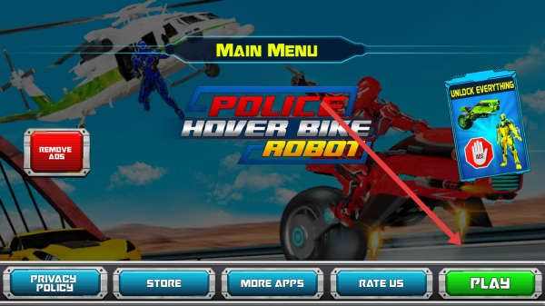 1、点击主菜单【PLAY】,进入【Police-Hover-Bike-Robot】,开启机甲摩托竞速/战斗冒险。