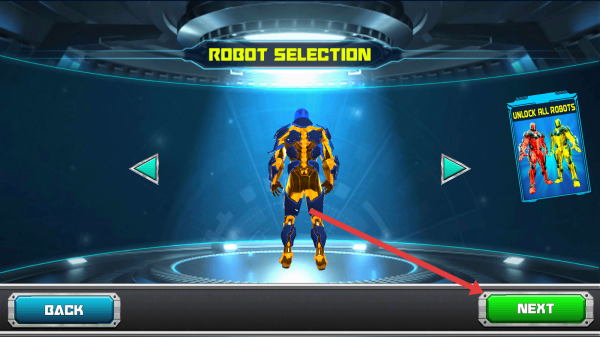2、在机器人选择页,确认黄色机甲,点击【NEXT】,进入关卡选择,准备挑战不同场景任务。
