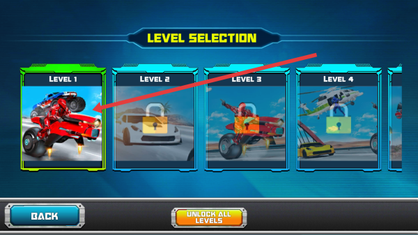 3、选【LEVEL-1】(红色摩托关卡),开始首关,操控机甲摩托,完成竞速/战斗目标,解锁后续关卡。