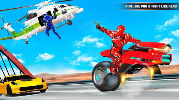 2、人车结合创新玩法:巧妙将摩托车与游玩人物结合,机器人可变形为飞行自行车,在巡逻与战斗中展现独特的操作魅力。
