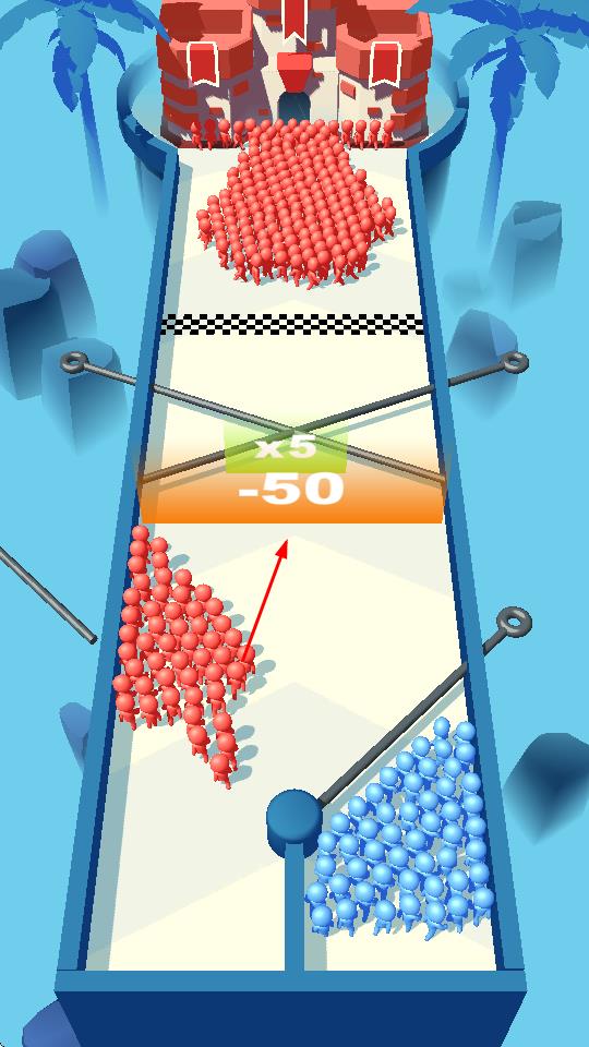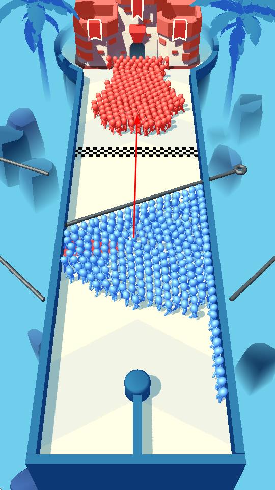 1、通过拔插销,分割蓝色人群,调整行进路线,让部分人群通过增益区,强化兵力。