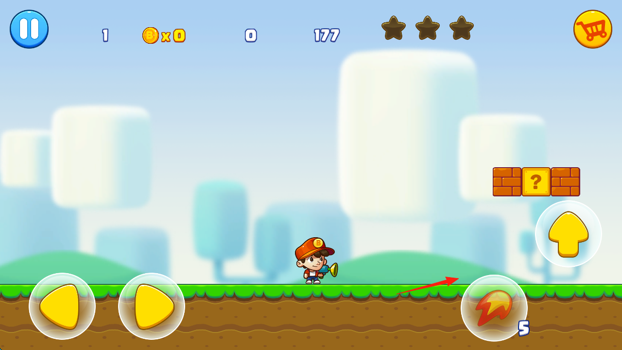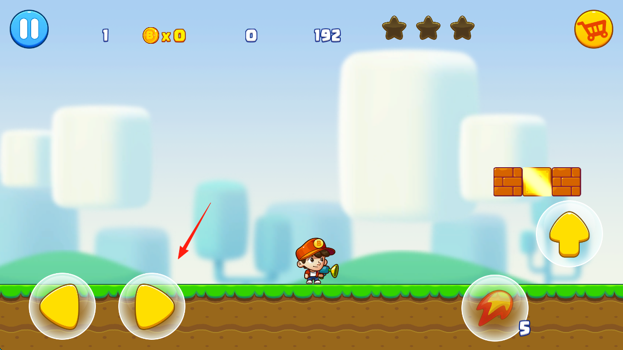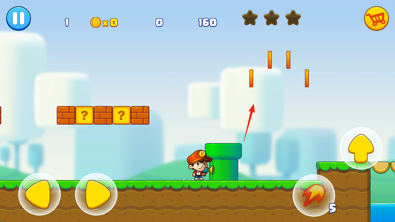 2、遇到问号砖(红箭头),跳跃撞击,触发道具(金币技能),用火焰弹(右技能),破坏砖块。