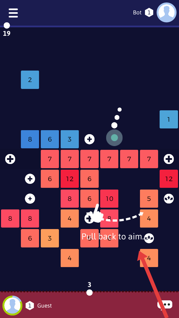 2、根据提示【Pull back to aim】,拉动瞄准发射小球,借助撞击消除方块、获取分数,推进关卡。