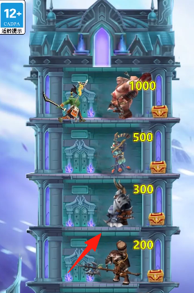 1、选择楼层敌人(红箭头),优先挑战低数值(200/300),快速积累胜场,解锁基础奖励。