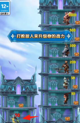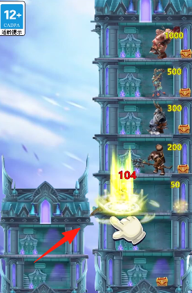 3、挑战高层(红箭头),消耗资源,激活技能(104伤害),精准打击高数值敌人,突破塔楼,解锁新楼层。
