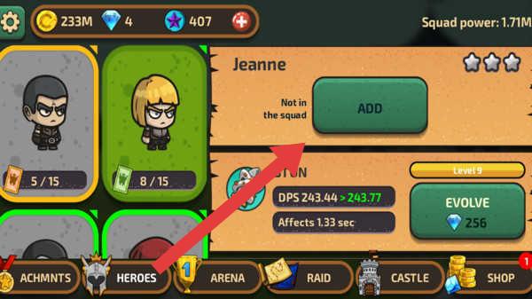 1、在英雄界面,点击【ADD】,将“Jeanne”加入队伍,提升战力(1.71M),为战斗做准备。