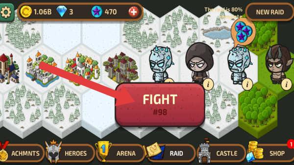 2、进入世界地图,点击【FIGHT#98】,挑战关卡,搭配队伍,利用英雄技能,推进地图进度。