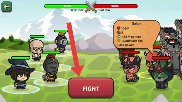 3、战斗场景中,点击【FIGHT】,触发自动战斗,观察英雄输出(如Satan属性),调整阵容,赢取胜利。