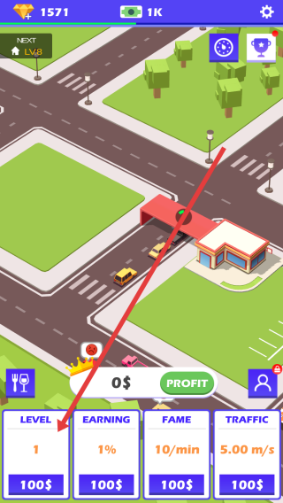 1、在餐厅界面,点击【LEVEL-1】,花费100$升级,提升餐厅等级,解锁新功能,增加收益。