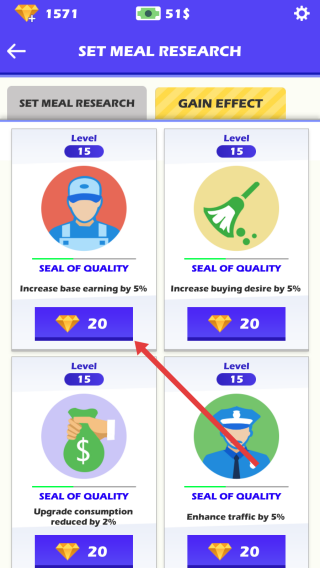 2、进入研发页,选择“SEAL-OF-QUALITY”(提升基础收益5%),花费20钻石升级,强化餐厅属性。