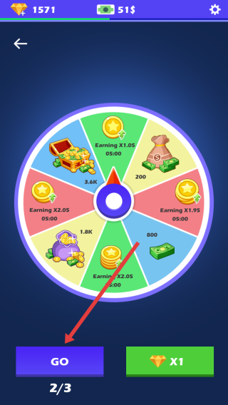 3、在转盘界面,点击【GO】,消耗次数抽奖,获取金币、收益加成(如Earning-X1.05)等奖励。