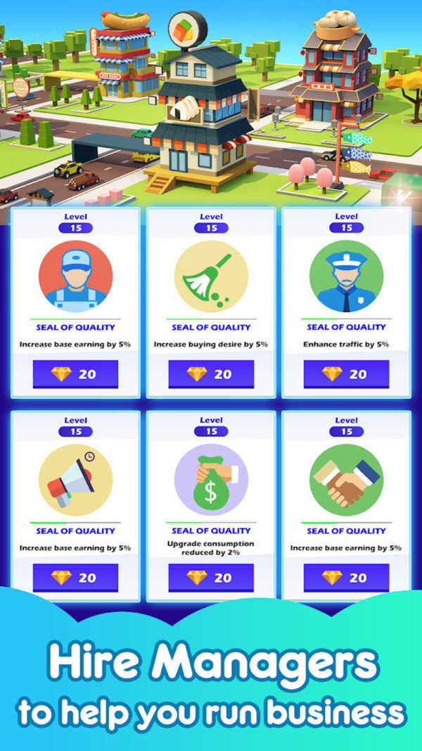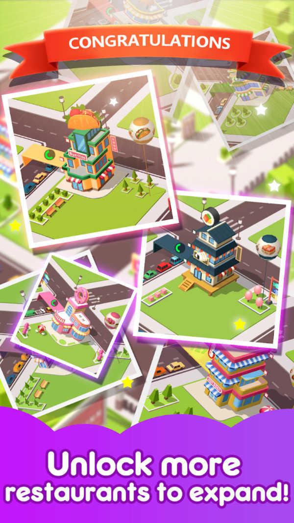 2、精美视觉呈现:采用精彩动画图形与特色建筑风格,从美式汉堡店到日式拉面馆,不同主题餐厅外观与内饰细节丰富,视觉体验舒适。
