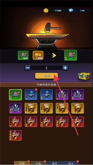 3、装备锻造界面,可消耗材料(如金币176M、钻石144)锻造装备,提升英雄战力,推进养成玩法。