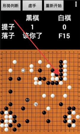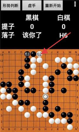 2、棋盘对局时,按规则落子,可提子、利用形势判断分析棋局,点击“重新开始”开启新局。