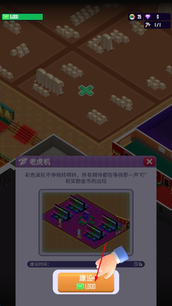 1、进入游戏后先选择赌场场地,放置基础博彩设施,如轮盘桌和老虎机,设定游戏规则后开启营业迎接首批客人。