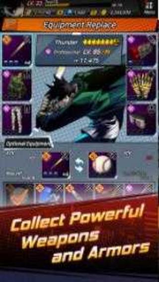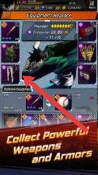 2、进入装备界面,点击箭头指向装备,替换/强化,提升角色战力(Collect-Powerful-Weapons)。