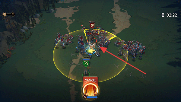 2、战斗界面,部队作战场景,可释放技能(如圆形范围技能),显示战斗时间、资源,推进策略对战。