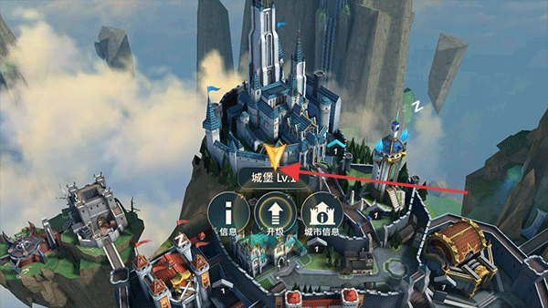 3、城堡界面,显示“城堡Lv.2”,有“信息”“升级”“城市信息”操作,用于建设发展,提升基地实力。