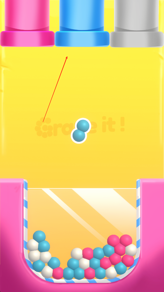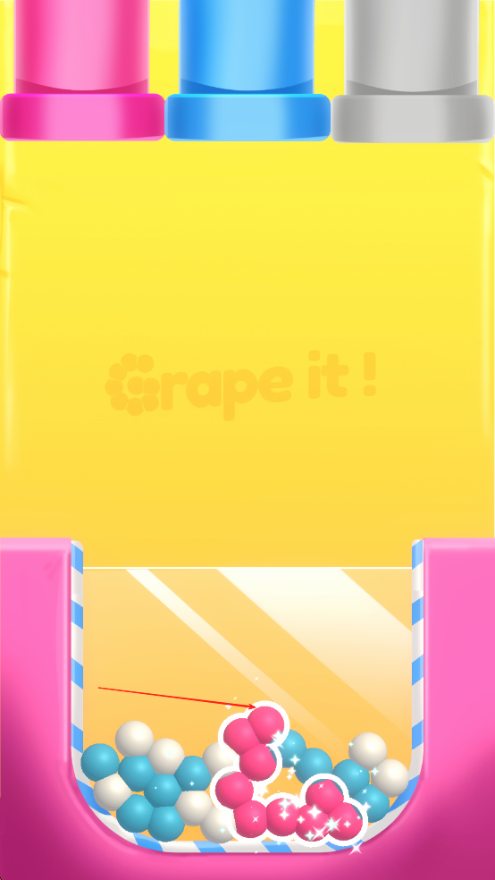 1、进入游戏后观察屏幕中相连的彩色葡萄球分布,点击屏幕下方的吸附道具,对准目标颜色小球释放,初步尝试将同色小球吸附分离。