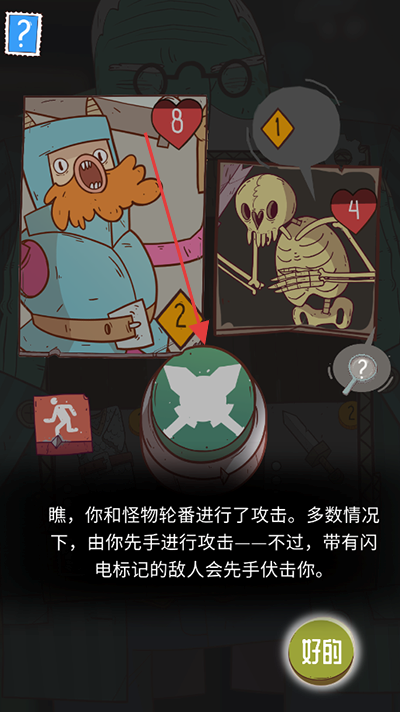 3、点击绿色图标发起攻击,多数情况下是玩家先手,不过带有闪电标记的敌人会先手伏击你。