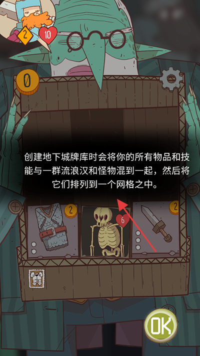 2、游戏准备阶段,创建地下城牌库时会将你的所有物品和技能与一群流浪汉和怪物混到一起,然后将它们排列到一个网格之中。