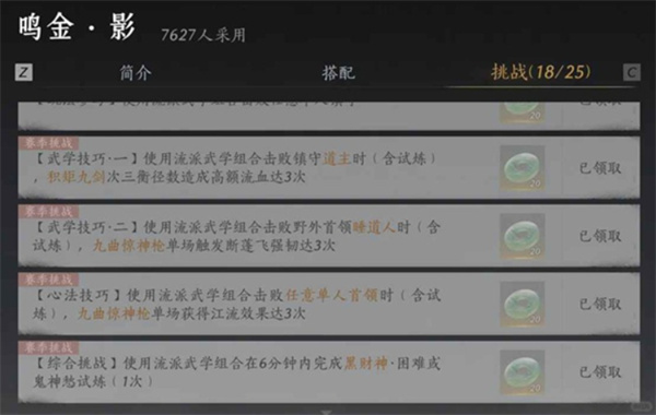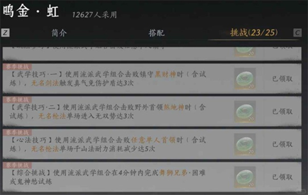技能要求:无名剑武学技"铁布衫"成功格挡3次Boss致命技能;无名枪特殊技"破阵突"命中Boss 3次;装备心法"千山法"状态下,使用无名枪武学技"霸王卸甲"5次。