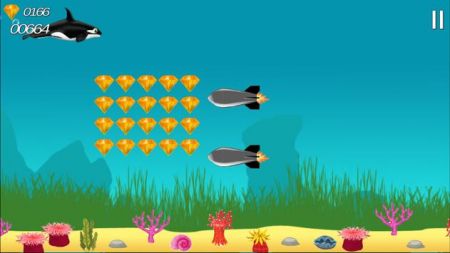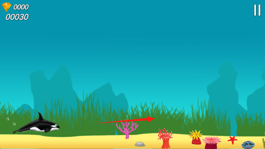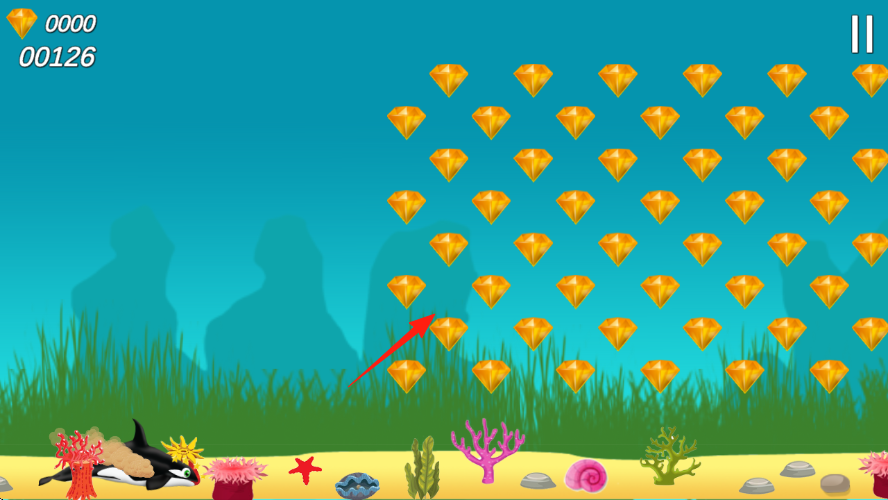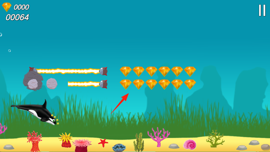 1、滑动屏幕(红箭头),控制虎鲸,躲避导弹,收集前方钻石,熟悉操作节奏。