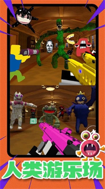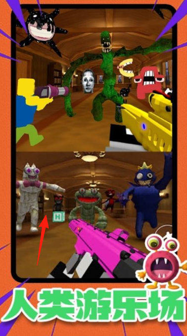 1、选“人类游乐场”,操控角色,用武器射击怪物,优先攻击血少目标,收集场景道具(药包)。