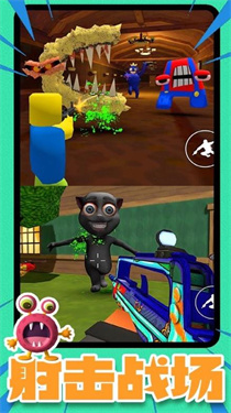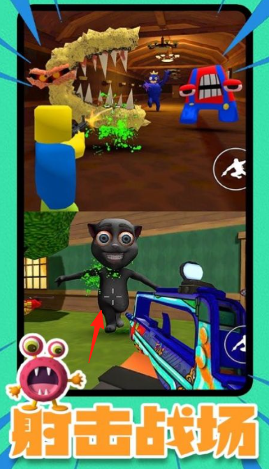 2、进入“射击战场”,切换武器(粉色枪),瞄准移动怪物(黑猫),利用掩体,躲避攻击,积累连击。