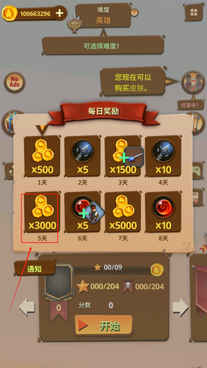 3、查看左下角"通知"获取提示,在难度选择界面用红框标注"英雄"模式,同时注意连续登录奖励的3000金币等丰厚回报。