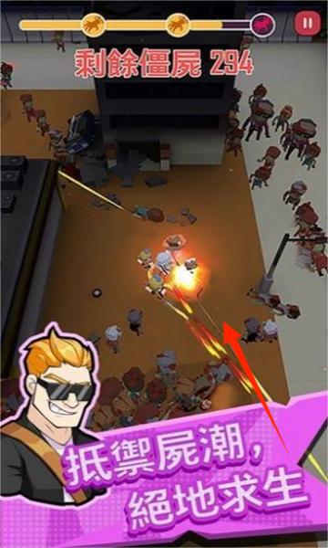 1、操控角色射击,清理僵尸潮,躲避攻击,存活到最后,完成挑战。