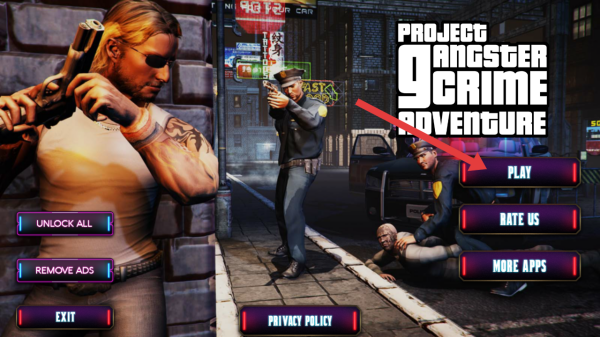 1、在敌人冒险计划的游戏主界面,点击右侧紫色【PLAY】按钮,开启黑帮犯罪冒险之旅。