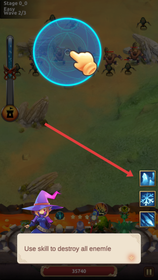 2、战斗时,点击箭头指向的技能图标,释放魔法技能(如蓝色技能),清除Stage0.0wave2/3的敌人。
