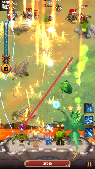 3、面对大量敌人,合理搭配技能,按箭头提示集火攻击,利用龙、巫师等防御单位,守护阵地,推进关卡。