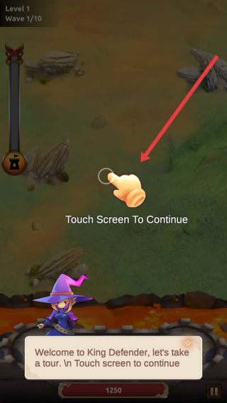1、在Level1启动页,点击屏幕(Touch-Screen-To-Continue),跟随引导,开启【King-Defender】塔防之旅。
