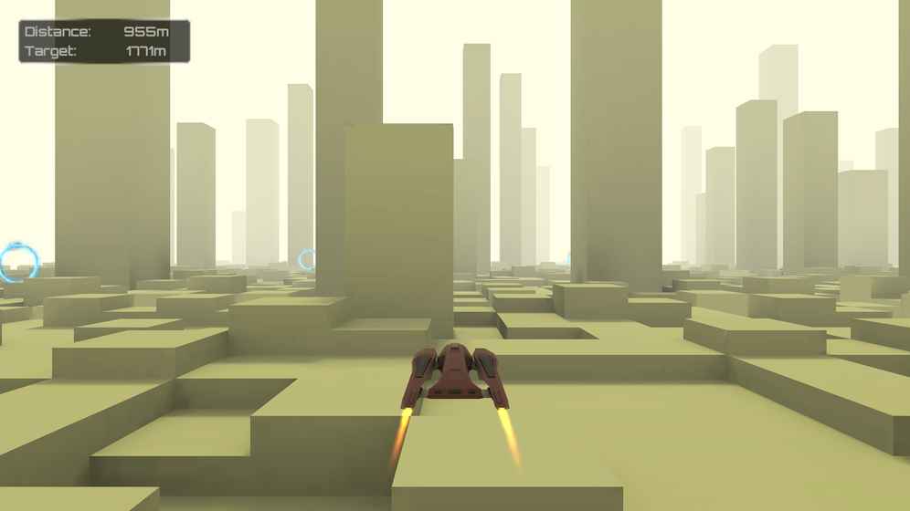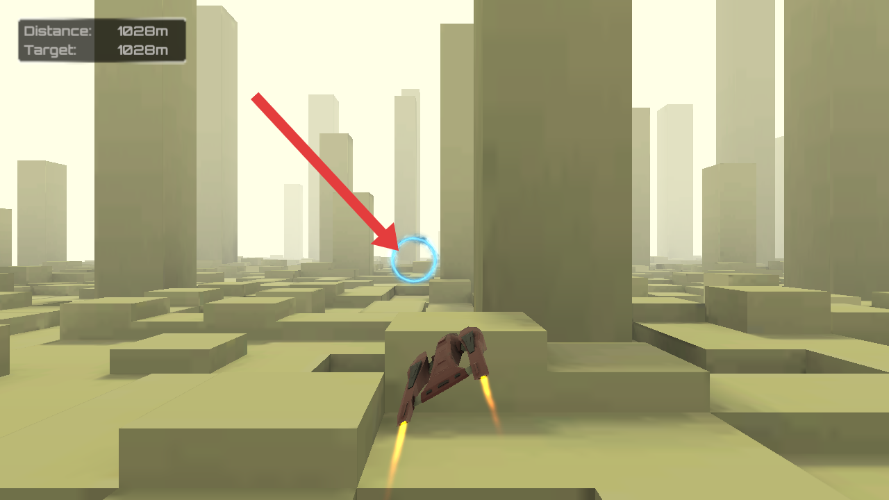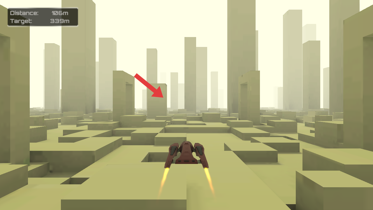 2、需要操控飞行器沿箭头指引方向前进,在城市建筑群中躲避这些障碍,推进至目标的距离。
