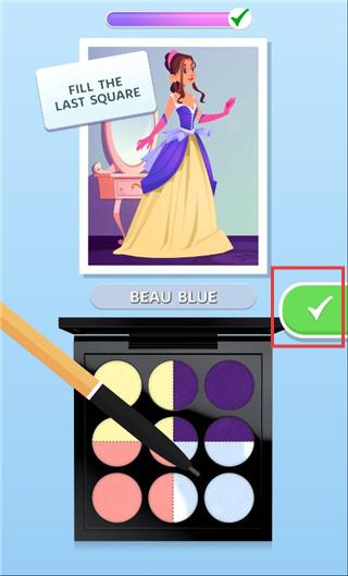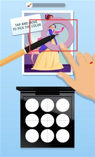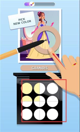 2、游戏中途需观察画作色彩分布,吸取颜色并进行混合调配,根据色调搭配逻辑打造符合审美风格的眼影盘。