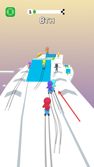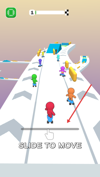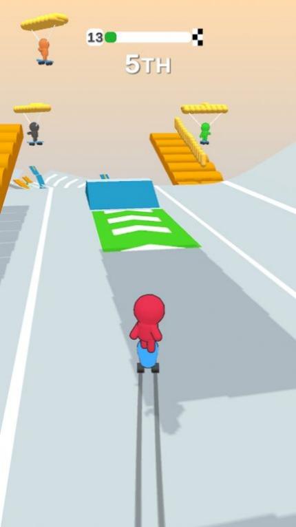1、滑动屏幕控红色滑板角色,沿赛道躲障碍(黄色柱),抢内道超对手(彩色彩虹人)。