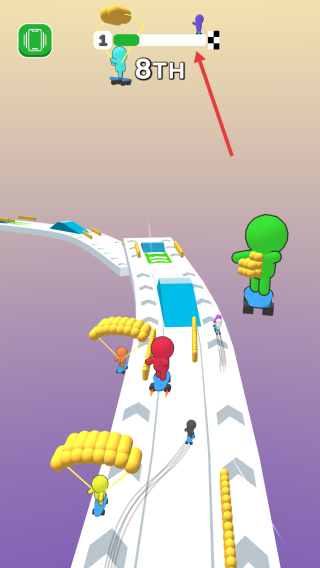 2、吃道具(降落伞、加速带),触发冲刺、飞行,快速提升排名(8TH→更高)。