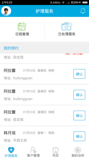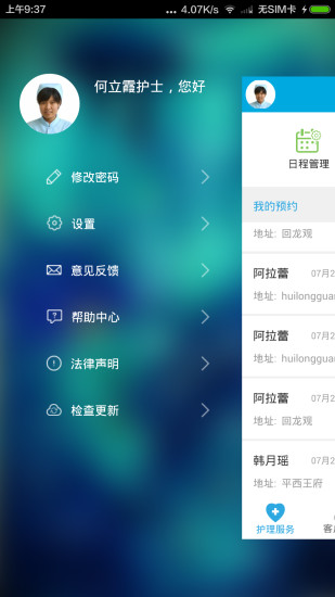 护理服务:可以在线确认自己的护理工作,进行日程管理,查看自己处理了的服务