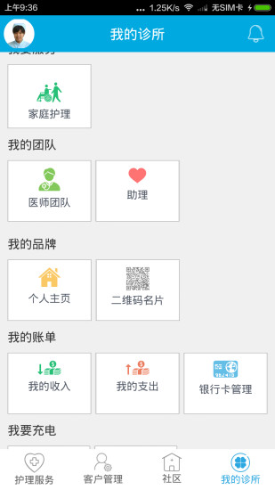 我的诊所:这里可以查看自己的团队人员,还有自己的品牌,以及自己的收支情况