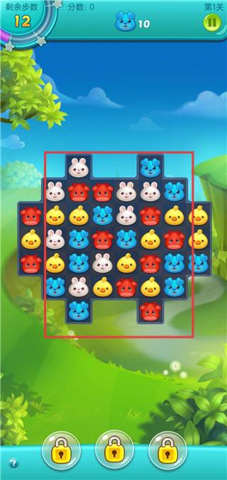 2、游戏中点击滑动动物方块,将三个相同宠物连成横/竖线即可消除,每关需在限定步数内完成指定消除数量、收集水果等目标才能通关。