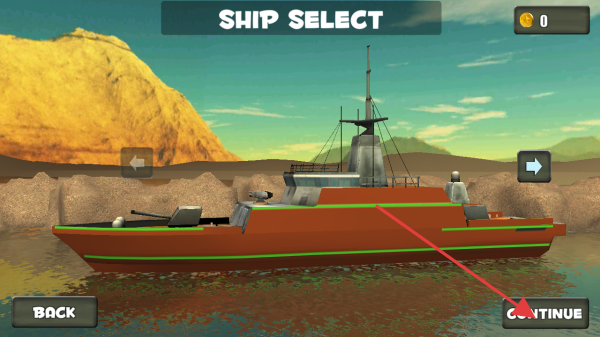 2、进入后,在【SHIP SELECT】界面选定橙色战舰后,点击右下角【CONTINUE】,进入战斗准备阶段。