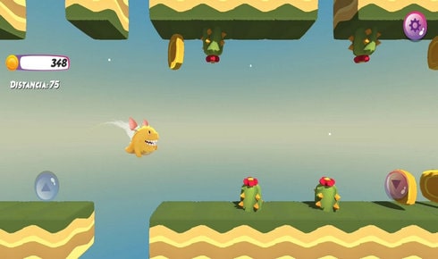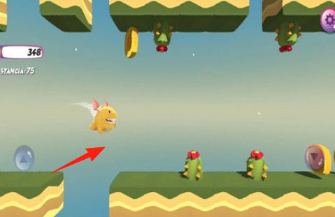 1、操控小黄鸭,跳跃躲避怪物(绿色龙),收集金币,熟悉操作,完成基础关卡。